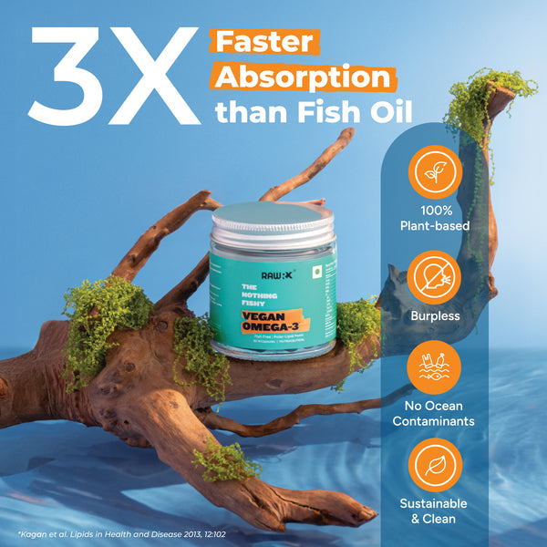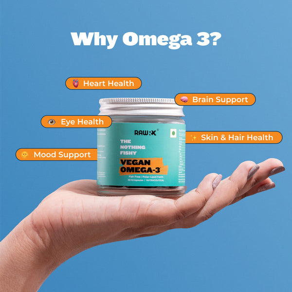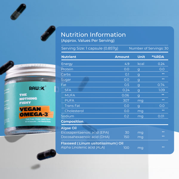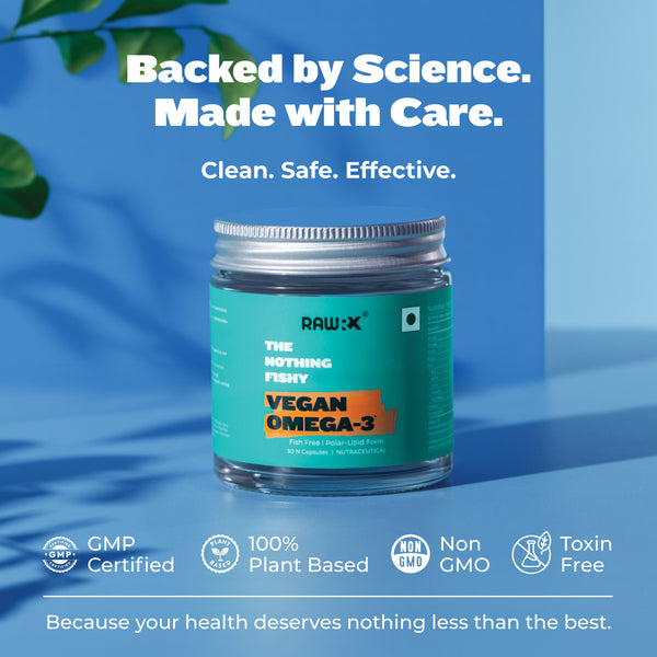 People who cannot meet their omega-3 dietary requirements and those who experience high levels of inflammation may benefit from taking omega-3 supplements. RawRX Vegan Omega-3 capsule is a better alternative compared to fish oil supplements. It is the only Omega-3 supplement available in India with all the three essential Omegas (EPA, DHA & ALA) in one capsule.